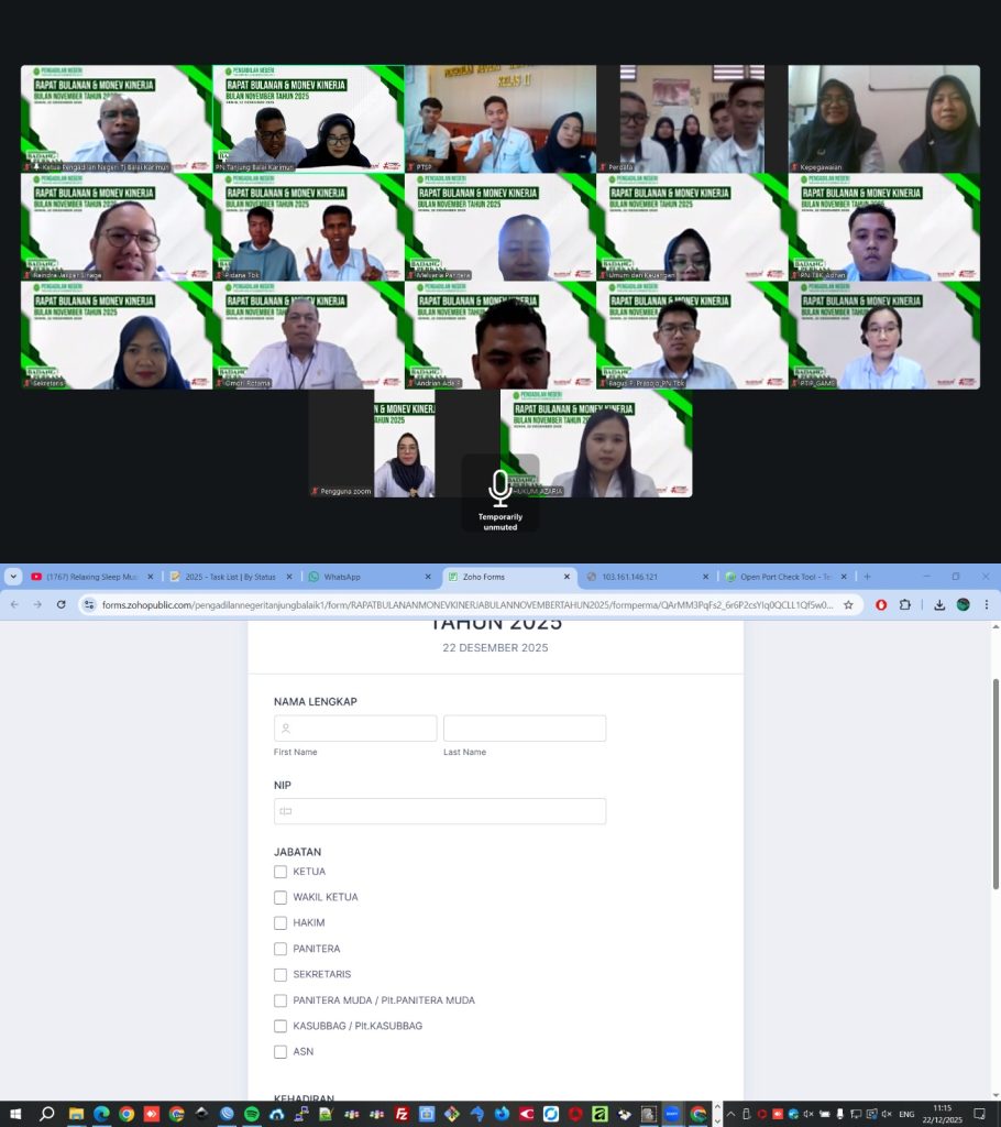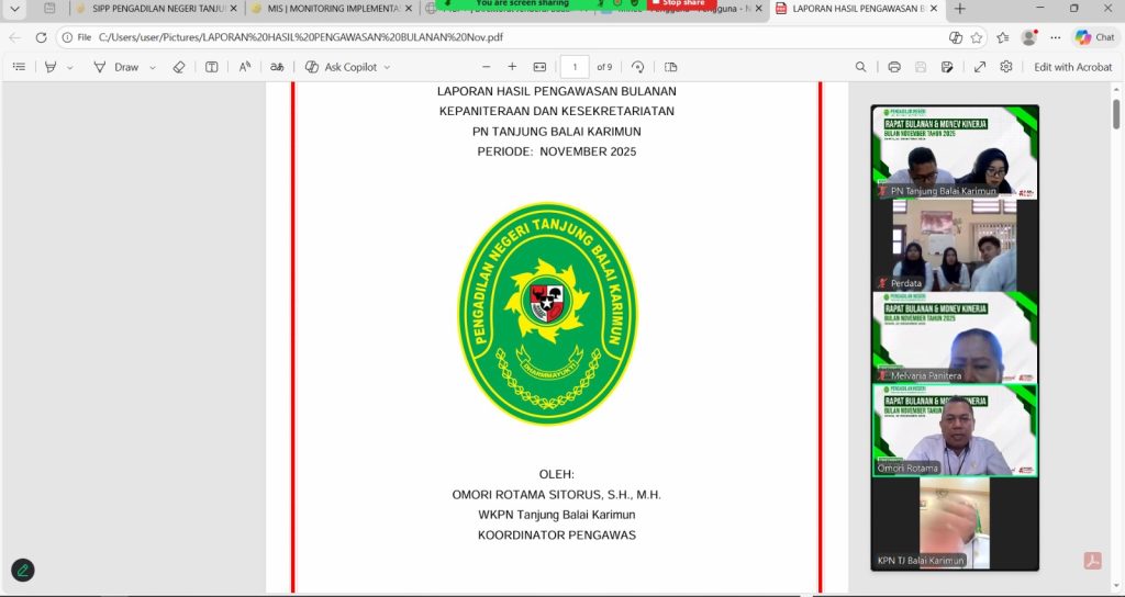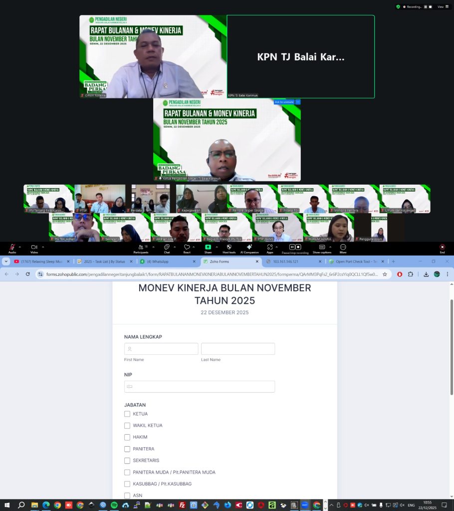 Bertempat di Pengadilan Negeri Tanjung Balai Karimun, dilakukan rapat monitoring dan evaluasi kinerja bulan November 2025 secara daring yang diikuti oleh seluruh aparatur Pengadilan Negeri Tanjung Balai Karimun yang dipimpin langsung oleh Ketua Pengadilan Negeri Tanjung Balai Karimun, Bapak Edy Sameaputty, S.H., M.H. dan Wakil Ketua Bapak Omori Rotama Sitorus, S.H., M.H.